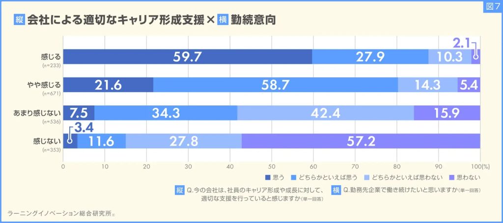 さらに、会社からのキャリア形成支援の有無と勤続意向の関係性について調べるため、勤続意向に関して「勤務先企業で働き続けたいと思うか」を質問。
