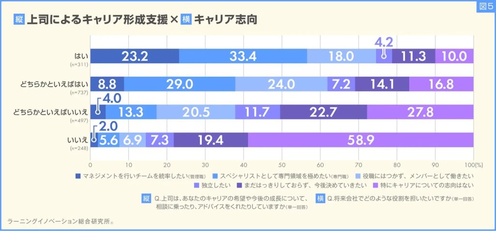 管理職志向と専門職志向の回答割合は、上司からのサポートの度合いによって高まり、上司からのサポートの度合いが低くなるほど、未定・キャリア志向なしの割合が高まる結果に。