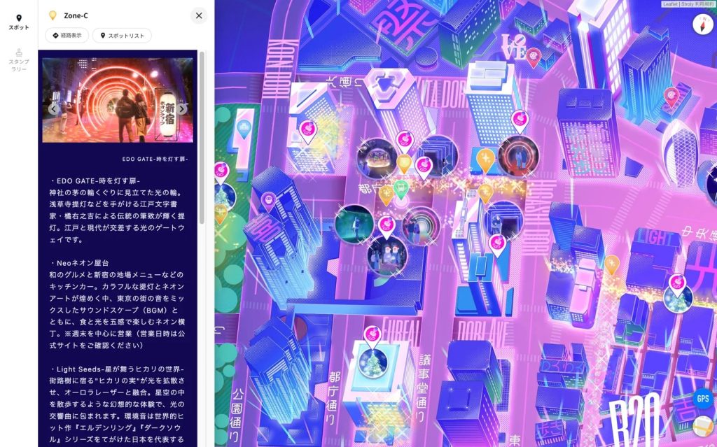 デジタルマップは新宿エリアの観光情報をイラストとともに掲載し、インバウンド向けに日英2言語に対応。スタンプラリーにはアプリ不要でスマートフォンから参加でき、マップを開くことでチェックイン機能が利用できる。