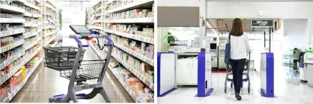 同店舗は、IoT機器やAI技術を活用した次世代型スマートストアであり、セルフレジ機能付き買い物カート「レジカート」80台、店内デジタルサイネージ「インストアサイネージ™」24台を導入。