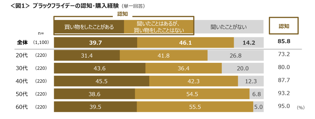 調査の結果、ブラックフライデーの認知率は85.8%で、買い物経験がある人は39.7%だった。