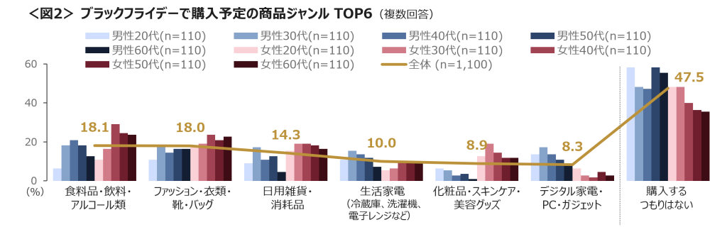 また、男性はブラックフライデーで「購入するつもりはない」と回答した割合が高く、女性よりもセールに対する関心が低い傾向に。