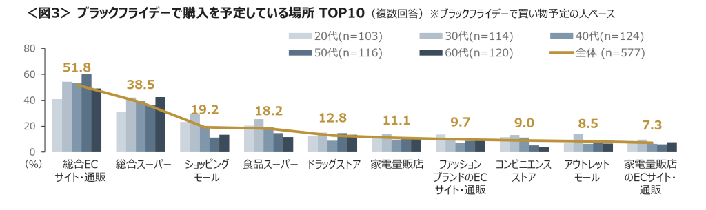 ブラックフライデーで購入を予定している場所は「総合ECサイト・通販」が51.8%で最多だった。50代は60.3%と特に高かった。一方、30代は「ショッピングモール」「食品スーパー」で買い物をする人が多いことが明らかになった。