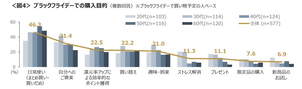 ブラックフライデーで買い物をしようと考えている理由・目的は、「日常使い(まとめ買い・買いだめ)」が46.3%で最も高く、続いて「自分へのご褒美」となった。「自分へのご褒美」目的で買い物をする人は30代で高く、4割を超えた。