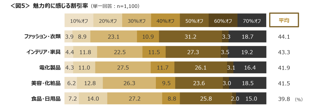 セールで魅力的だ(買いたい)と感じ始める割引率は、「ファッション・衣類」「インテリア・家具」「電化製品」「美容・化粧品」「食品・日用品」の4ジャンルいずれも平均で40%オフ程度だった。