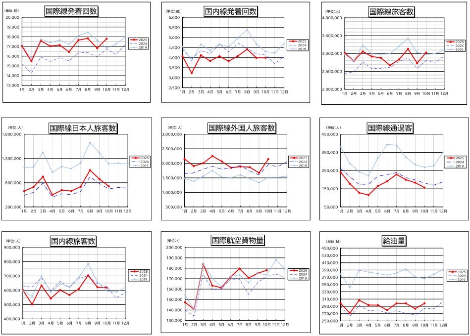 航空旅客数は、国際線における継続的な訪日需要の高まりにより、364万人(前年同月比106%)と、10月として過去最高。国際線外国人旅客数は同様の要因により214万人(前年同月比110%)となり、10月として過去最高となった。
