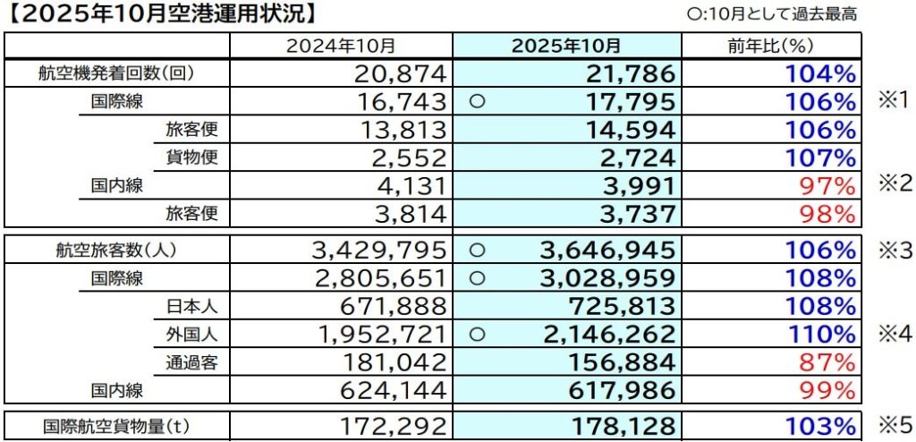 成田国際空港は、2025年10月の空港運用状況を発表した。