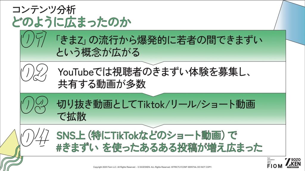 特にYouTuberのとうあ氏が生み出した「きまZ(きまぜっと)」というフレーズの流行やレインボーやジャルジャルといったお笑い芸人による「気まずいシチュエーションコント」がTikTokやYouTubeショートで拡散されたことが大きく影響しているという。