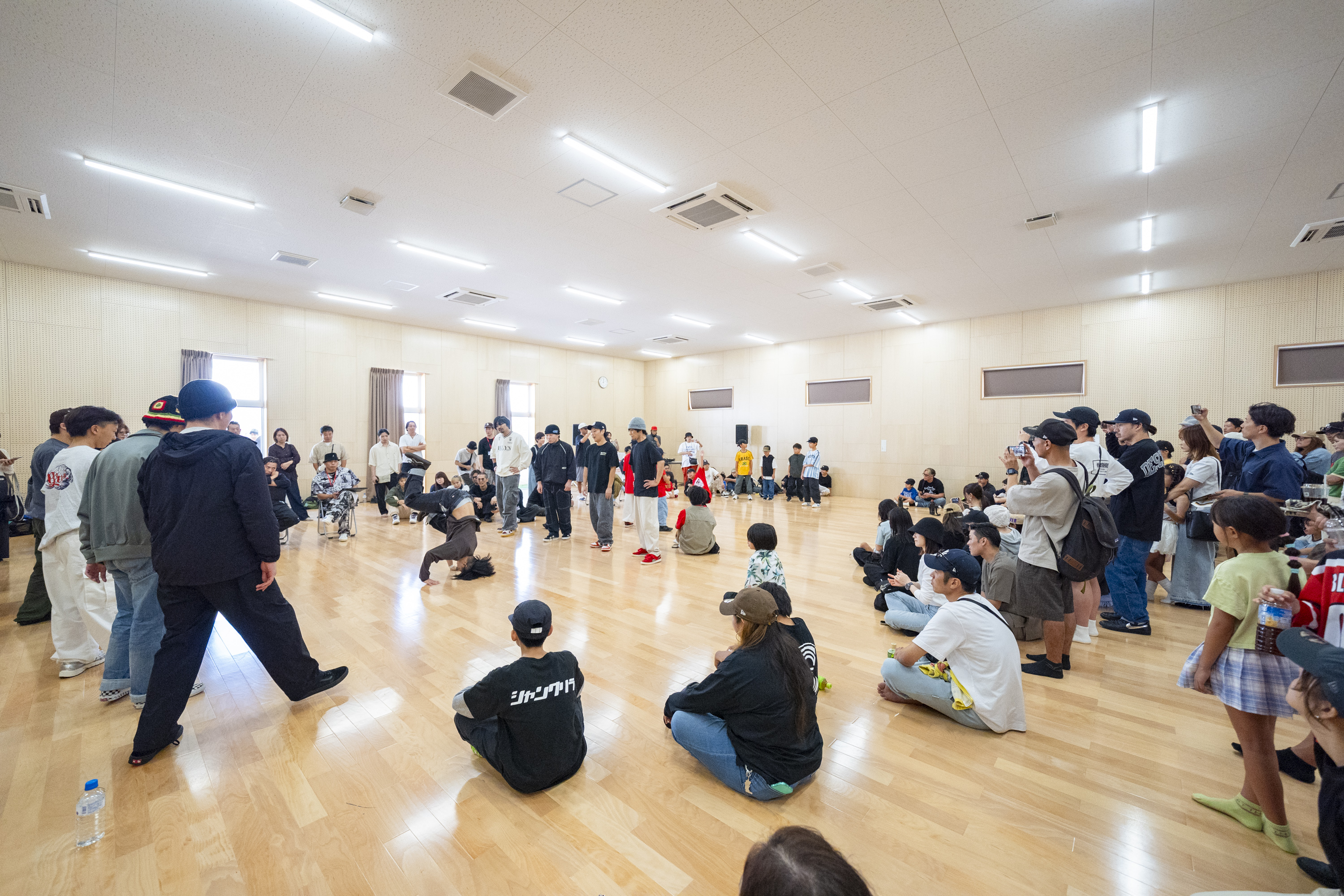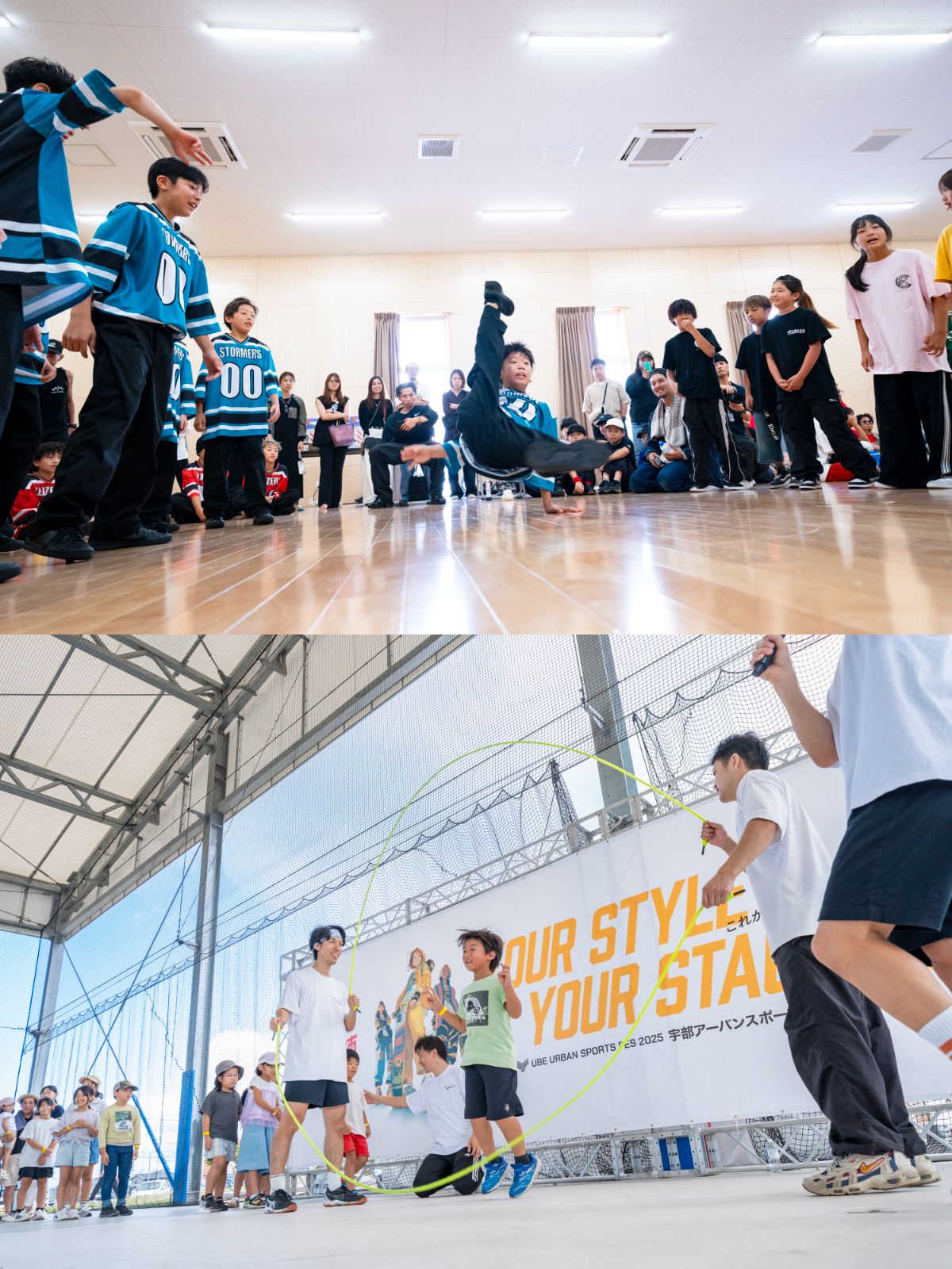 「にぎわい交流施設」ではブレイキン大会「UBE BREAK BATTLE 2025」が行われ、子供から大人まで、アクロバティックな技を披露した。「屋根付きグラウンド」では初心者向けの体験教室で、子供たちが目を輝かせながら初めてのダブルダッチなどに挑戦。インストラクターの指導の下、盛り上がりを見せていた。