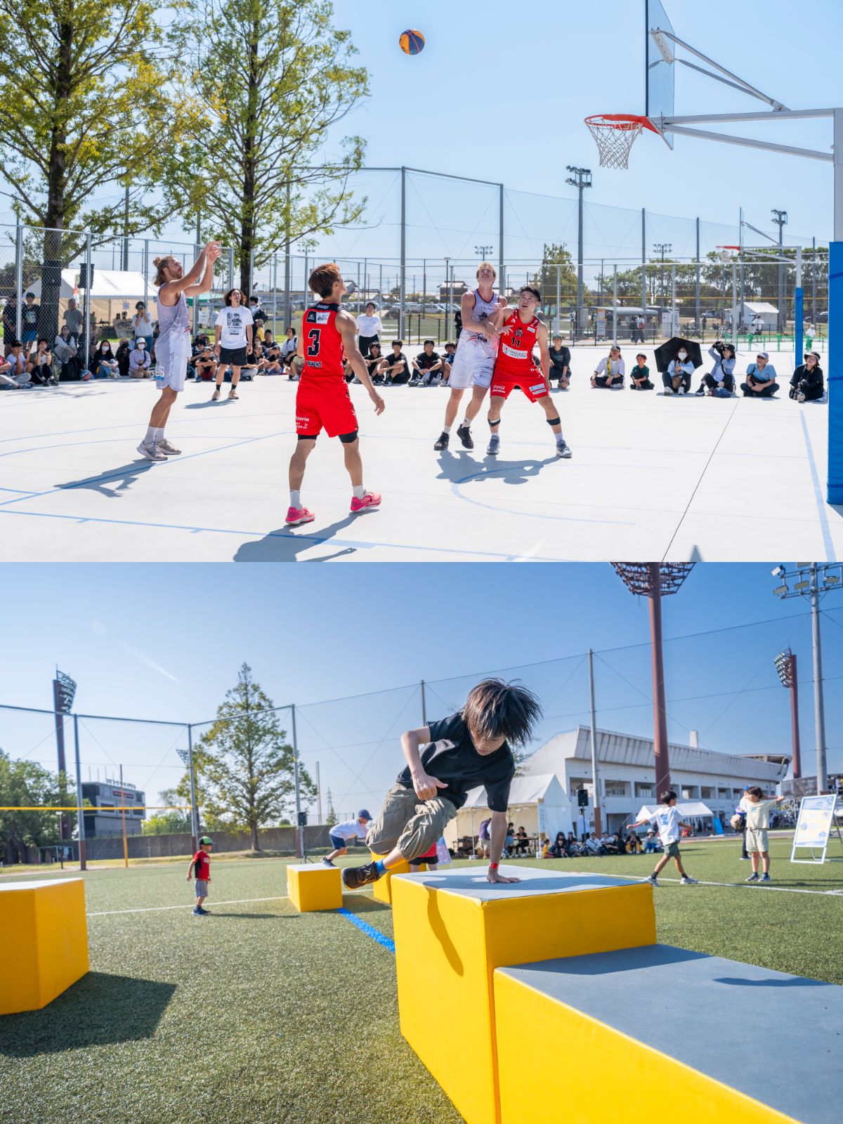 ほかにも3×3では、プロのバスケットボール選手のエキシビションマッチや、人工芝が一面を覆う「多目的グラウンド」ではパルクールの体験会も行われた。
