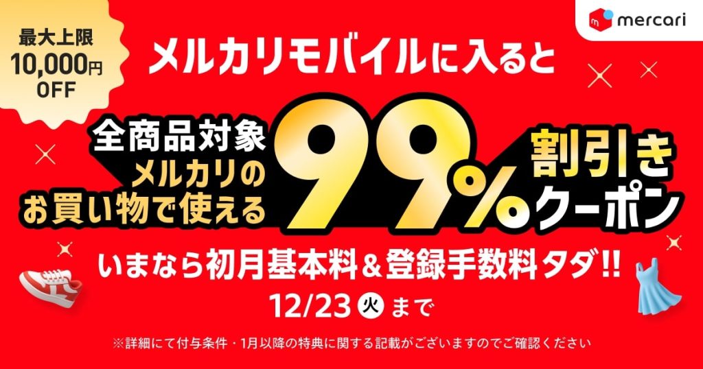 また、初めて「メルカリモバイル」を契約したユーザーを対象に、「メルカリ」で使える99%割引クーポン(最大上限10,000円)と、全プラン初月無料特典を提供するキャンペーンを12月23日まで実施している。特典は1名義に対し1回線分のみ適用され、複数回線契約時は容量が最も大きいプランが対象となる。
