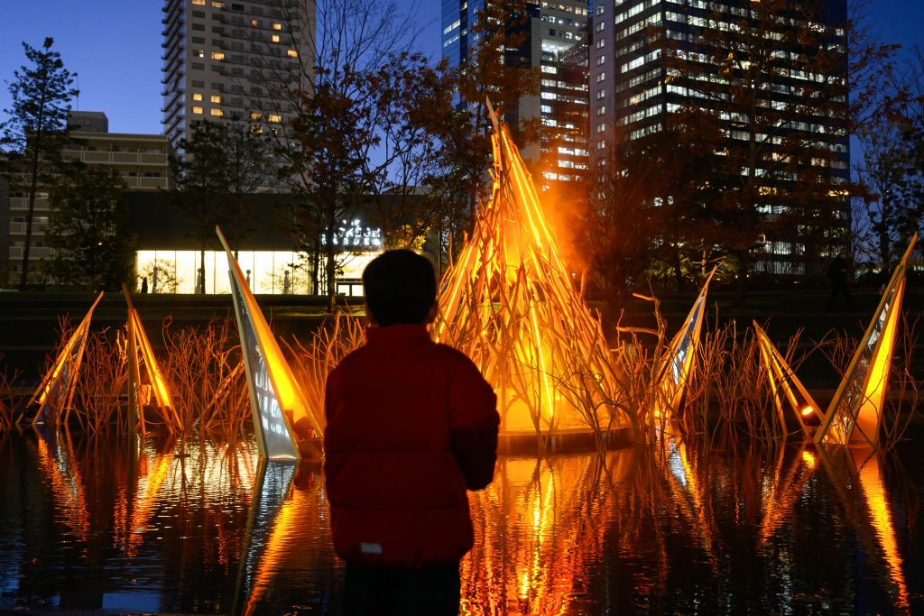 加えて、水盤エリアには炎を模した光のモニュメント「THE KAGARIBI」を初点灯。炎のように揺らめくLEDと水面の反射、薪がはぜる音を模したインスタレーションにより、視覚的・聴覚的にあたたかさを感じられる演出にしているという。