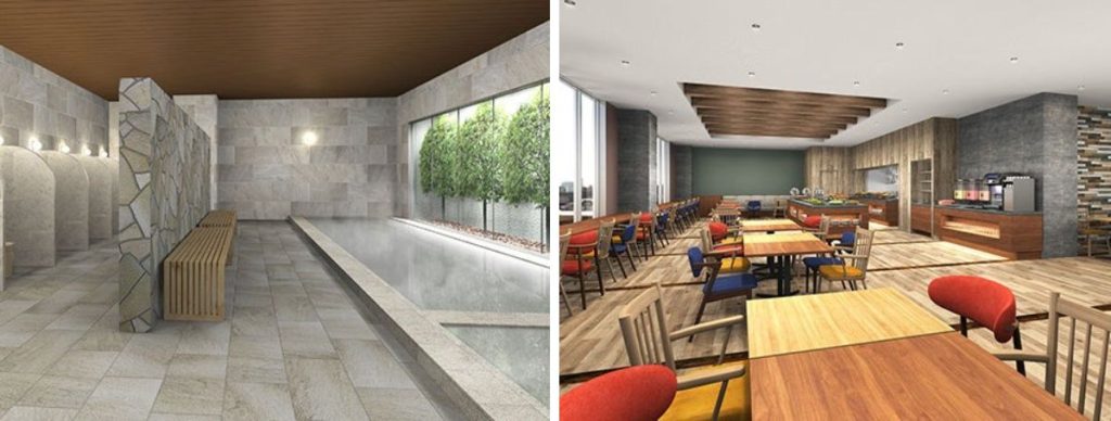 <1階>大浴場(男性用サウナ・水風呂)、リラクゼーションラウンジ、 コインランドリー、駐車場150台(予定)