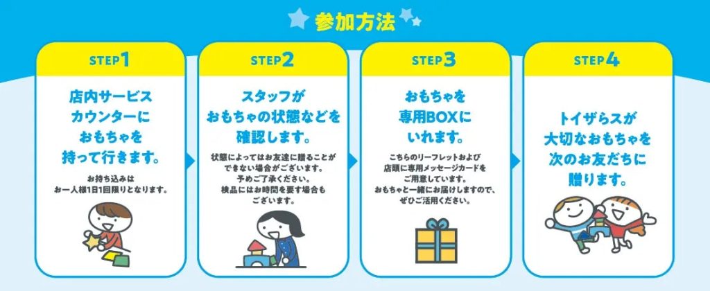2025年3月に池袋サンシャインシティ店で試験的に開始され、5月・8月にも同店で実施。3回で集まった329点のおもちゃは10月中に近隣の児童養護施設へ寄付済みだとしている。
