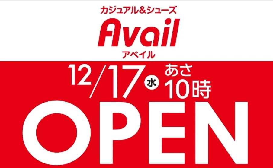 オープンを記念し、12月17日から25日までの期間中、商品を1点以上購入しアベイルアプリの本会員証を提示した来店者に対し、後日同店で利用できるクーポンを配布するという。クーポンは税込5,000円以上の会計で1,000円引き、税込3,000円以上の会計で500円引きとなる。ゲスト会員は対象外。