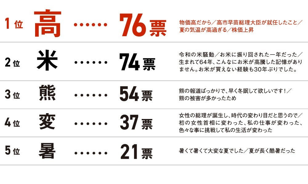 また、1位と1票差で2位の「米」は、米の価格高騰により振り回されたという声に加え、円安・米国経済ニュースの多さから“米(アメリカ)”を想起したという回答も寄せられていたとのことだ。