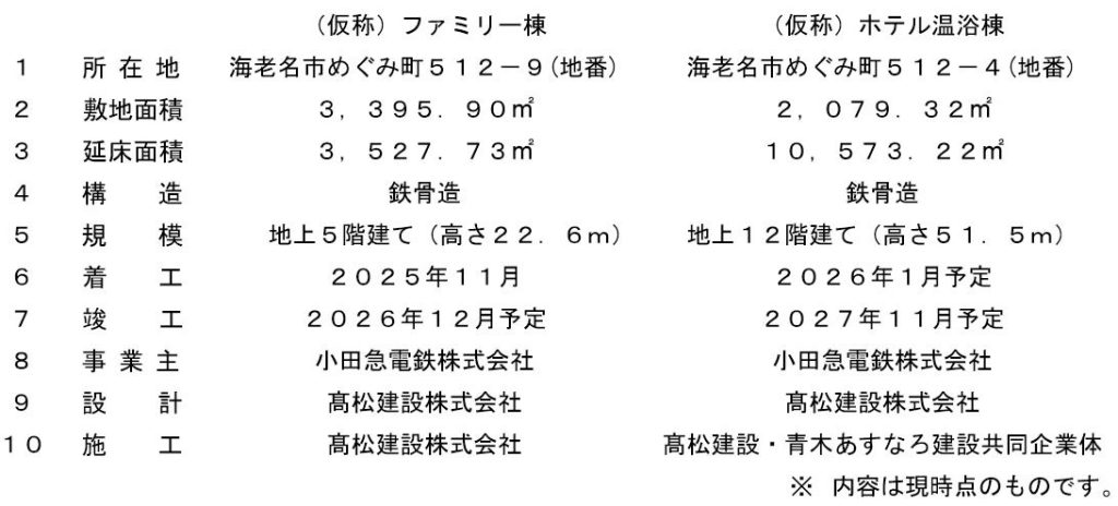 一方、「ホテル温浴棟」は、海老名駅前で掘削された約1,300メートルの地下から湧出する天然温泉を活用し、駅前という都市立地でありながら日帰り温泉と宿泊施設を融合した都市型温泉リゾートとして開発されるとしている。