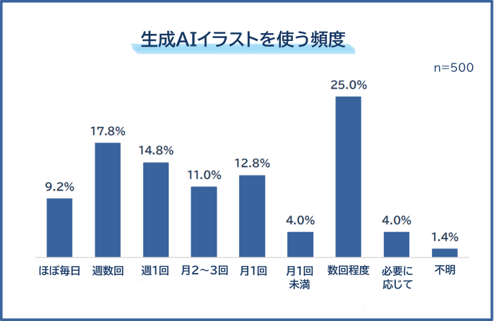 生成AIイラストを作成したことがある500人に使う頻度を聞いたところ、「(これまでに)数回程度(25.0%)」と回答した人が最多だった。