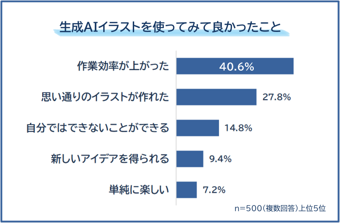 「生成AIイラストを使ってみて良かったこと」の1位は、「作業効率が上がった(40.6%)」、2位は「思い通りのイラストが作れた(27.8%)」だった。