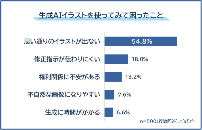 「生成AIイラストを使ってみて困ったこと」の1位は、「思い通りのイラストが出ない(54.8%)」だった。また、2位「修正指示が伝わりにくい(18.0%)」、3位「権利関係に不安がある(13.2%)」と回答した人も多くなっていた。