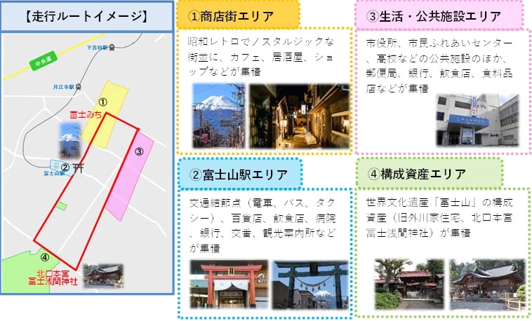 「富士みち」は富士山に向かって一直線に延びる道路で、周辺は「商店街」「富士山駅」「生活・公共施設」「世界遺産構成資産」の4つのエリアに分かれる。市内のアクセス向上に繋がるほか、訪日観光客の二次交通手段として地域の回遊性向上や地域経済への波及効果も期待されるという。