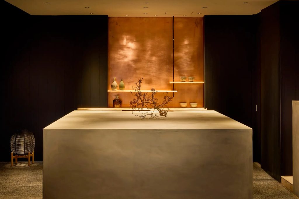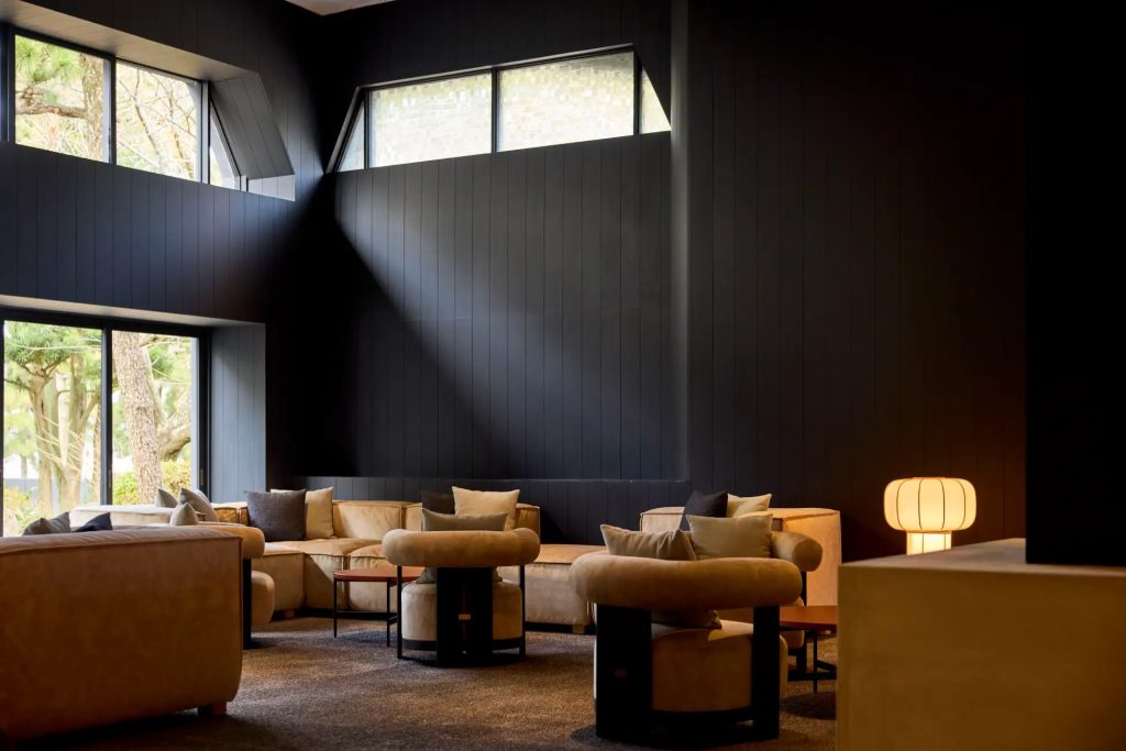 ロビーは、ONCRIの象徴である大きな暖簾をくぐる動線が特徴で、焼杉の壁や左官仕上げの床、石庭を想起させる設えを取り入れたとのことだ。高い天井と黒を基調とした空間に隣接するラウンジでは、開放的な雰囲気の中でチェックインを行える設計としている。