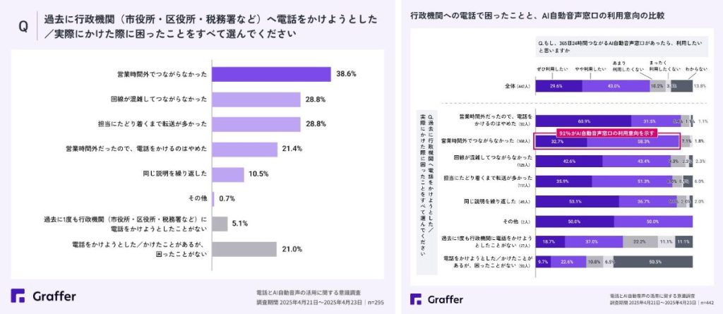 特に過去に行政機関へ電話をかけようとして「営業時間外でつながらなかった」(38.6%)経験がある層では、91.0%がAI自動音声窓口の利用を希望。行政サービスにおける市民の利便性向上のために、時間を問わず相談できる窓口やAI導入へのニーズの高さが浮き彫りとなった。