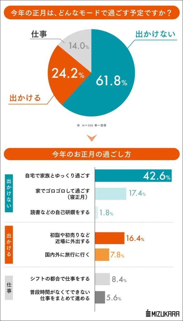ミズカラは、25歳~59歳の既婚有職男女500名を対象に「年末年始の過ごし方と仕事満足度の相関」調査を実施し、その結果を公表した。