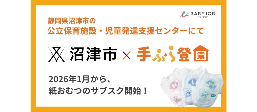 BABY JOBは、2026年1月より、静岡県沼津市のすべての公立保育施設・児童発達支援センター(8園)において、保育施設向けの紙おむつとおしりふきのサブスク「手ぶら登園」を開始すると発表した。