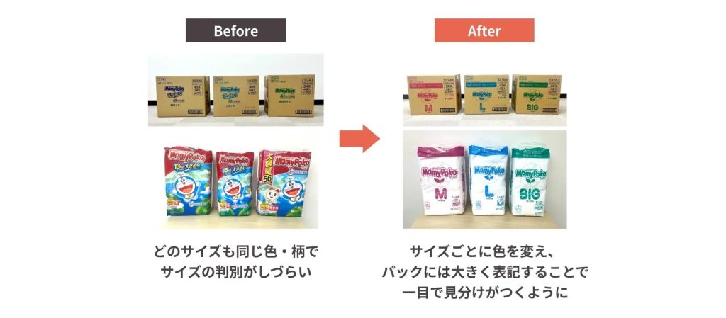 また、サイズがパッケージや段ボールに大きく表示され、さらに色分けもされているため、在庫状況を把握しやすくなっているとのことだ。