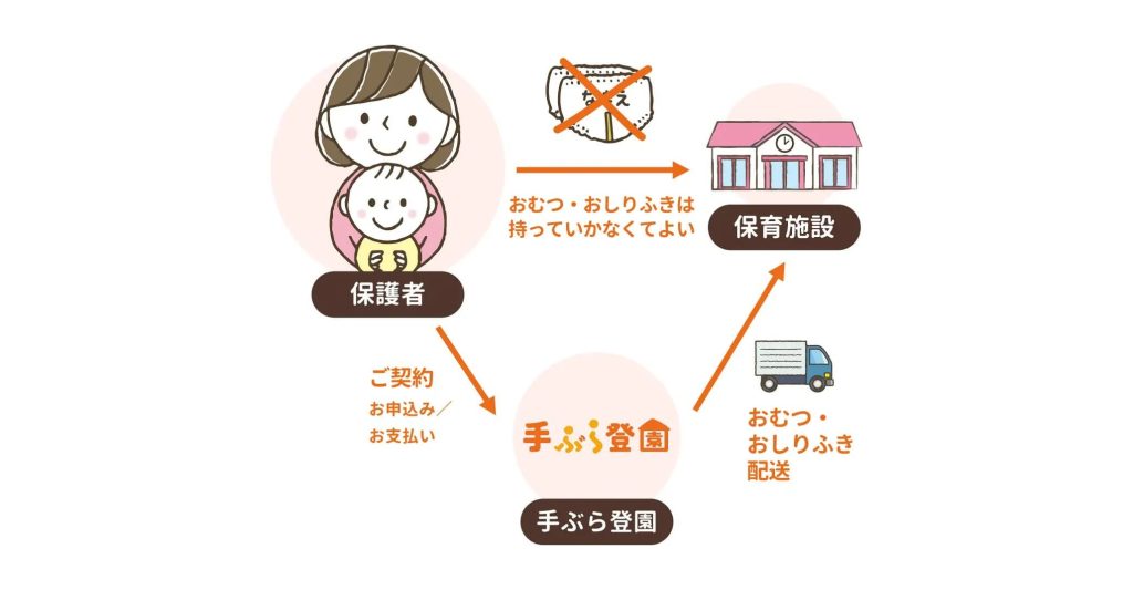 「手ぶら登園」が導入されることにより、保育施設に直接紙おむつとおしりふきが届くため、保護者は紙おむつに名前を書く手間や持参する手間が無くなるという。