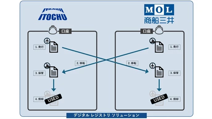 今回の取り組みの一環として、両社はユーザー企業として環境属性証明書の相互売買を実施した。商船三井は、従業員の航空機出張に伴うGHG排出量(Scope3カテゴリー6)の削減を目的に、伊藤忠商事が創出した航空分野の環境属性証明書を購入した。一方、伊藤忠商事は、海上輸送サービス利用に伴うGHG排出量(Scope3カテゴリー4)の削減を目的に、商船三井が創出した海運分野の環境属性証明書を購入したという。