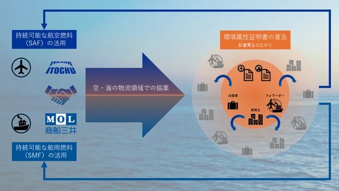 商船三井は船舶用低炭素燃料の活用、伊藤忠商事はSAFの利用といった強みを生かし、海運と空運の物流領域で協業することで、輸送サービスを利用する企業のScope3削減を支援する仕組みの構築を進めるとしている。