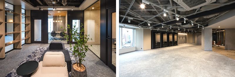 X-BASE SHIBUYAでは、オフィス内にラウンジや会議室の内装をあらかじめ整えた「ハーフセットアップオフィス」と、少人数から利用可能な家具付きの「スモールオフィス」の2種類のワークスペースを用意している。区画面積は約10平方メートルから約460平方メートルまで対応し、5種類のインテリアデザインを採用することで、多様なテナントニーズに応える構成とした。