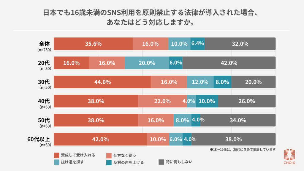 日本でも16歳未満のSNS利用を原則禁止する法律が導入された場合の対応を聞いたところ、「賛成して受け入れる」が35.6%、「仕方なく従う」が16.0%と、約半数が制度を受容する姿勢を示した。