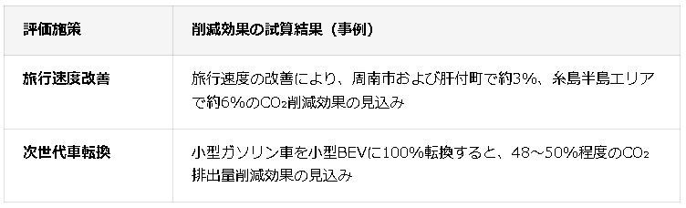 山口県周南市、福岡県糸島半島エリア、鹿児島県肝属郡肝付町での試算により得られた施策の評価結果は以下の図の通り。この結果により「旅行速度改善」と「小型ガソリン車の6〜13%程度を小型BEVに転換」は、同等程度のCO2削減効果が見込まれる。