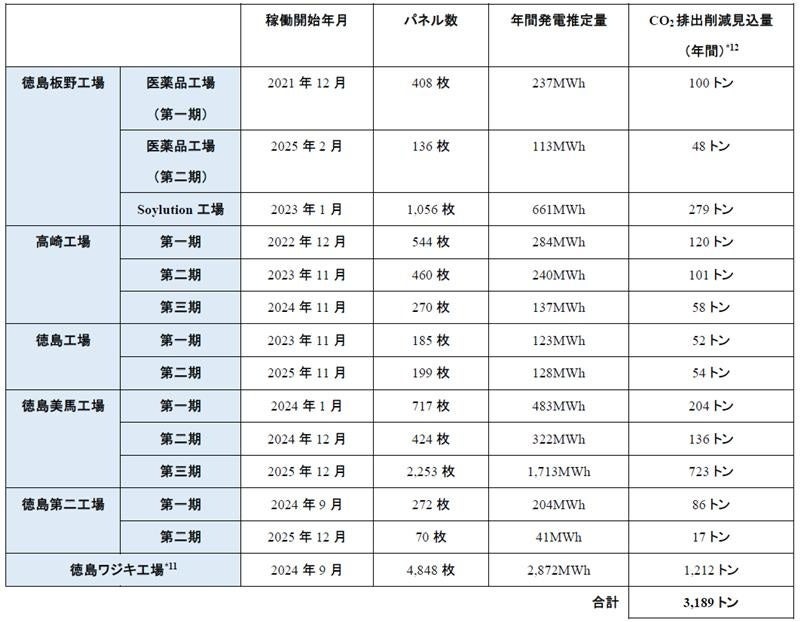 各設備は2024年9月から2025年12月までの期間にそれぞれ稼働を開始し、これにより太陽光発電設備によるCO2排出削減量は、国内6工場合計で年間約3,189トンの見込みとしている。