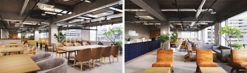 「シェアラウンジ」は、46席のワークスペースに加え、Web会議や通話に利用できるフォンブースを10室完備。固定席を必要としない方向けのプランや博多への出張時・外出時に作業やWeb会議が可能なドロップイン利用にも対応。