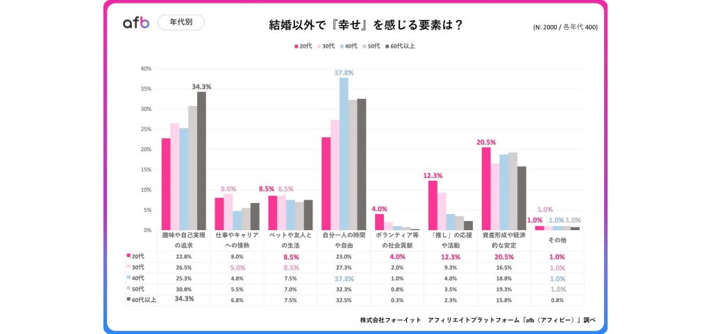 また、「推しの応援や活動」が12.3%と他年代より高く、感情的な充足や共感体験が幸福に直結していることが伺える。