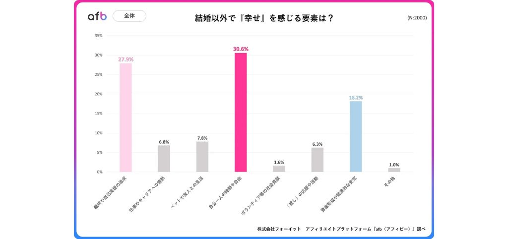 結婚以外で「幸せ」を感じる要素は何か聞いたところ、全体では、「自分1人の時間や自由」が30.6%と最も高く、結婚以外の幸福として他者に縛られない時間を重視する人が多くなった。