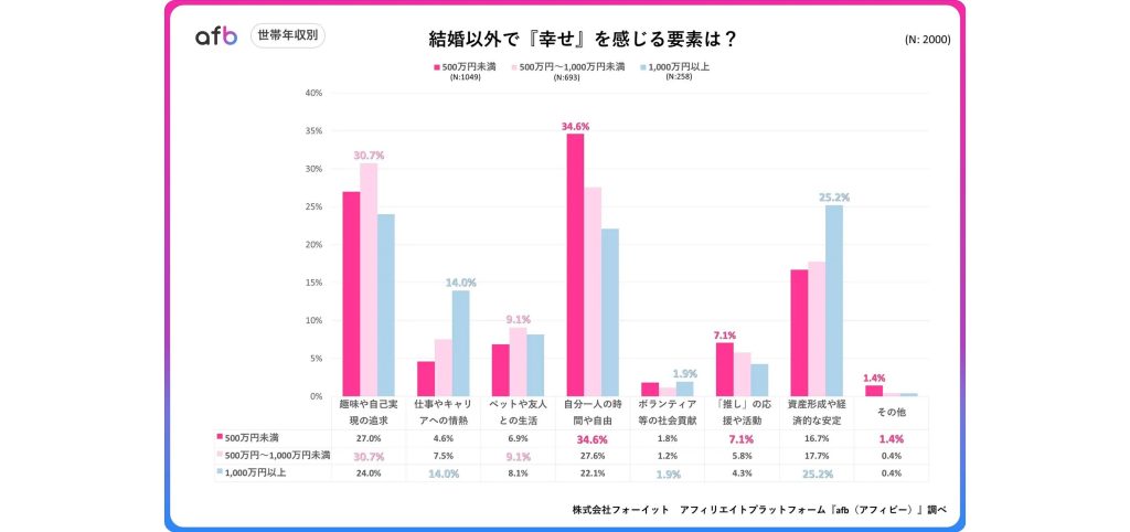 一方、世帯年収1,000万円以上の層では、「資産形成や経済的安定」や「仕事やキャリアへの情熱」と回答した人がそれ以外の層よりも多く、経済的余裕があるほど、将来への投資や自己成長を幸福の要素として捉えていることが明らかになった。
