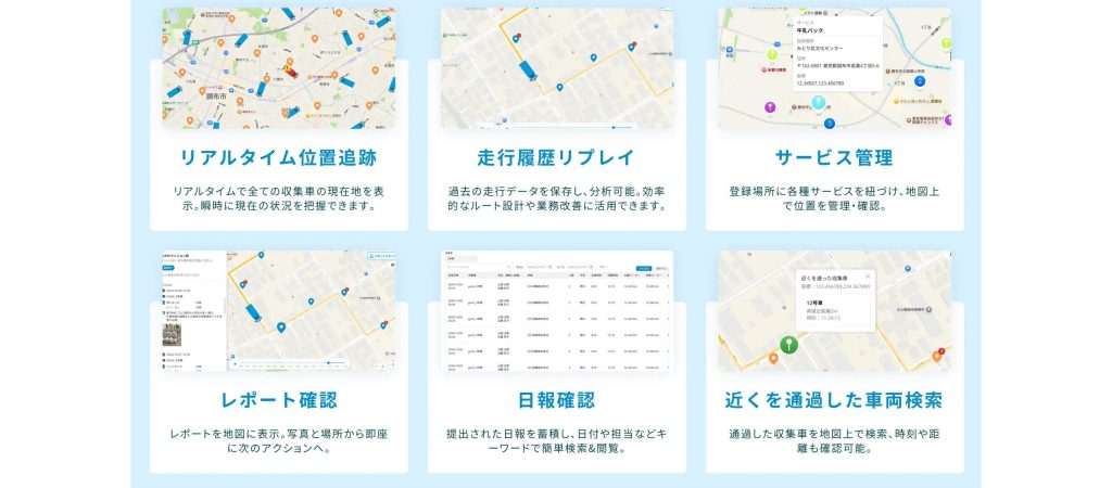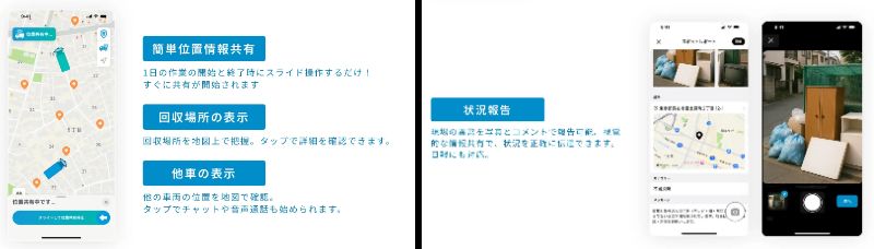 収集車両の現在地をリアルタイムで把握できるほか、集積所の汚れや違反ごみ、回収量などの現場状況を、写真と位置情報付きで報告と記録が可能となっている。
