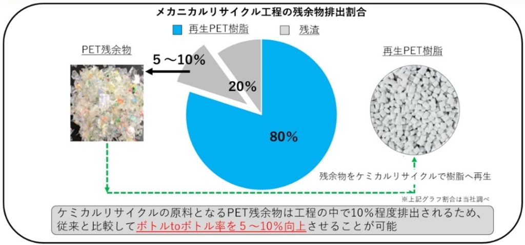 メカニカルリサイクルの工程で発生する「残余物」をケミカルリサイクルしていくことで、メカニカルリサイクルのみの場合を上回るリサイクル率を目指すとしている。