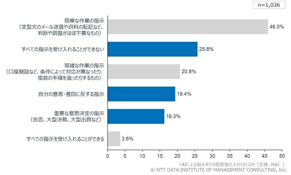 その結果、現段階で最も受け入れられているAIの指示は、判断や調整をほとんど伴わない「簡単な作業レベル」(46.0%)であることが明らかになった。