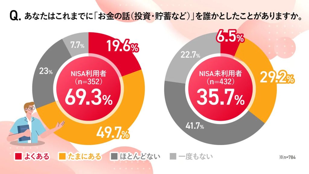相談環境に関する調査では、「これまでに投資や貯蓄などのお金の話を誰かとしたことがあるか」という設問において、お金の話をした経験がある人ほどNISAの利用率が高い傾向が確認された。