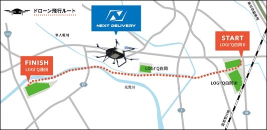 同実証実験では、同物件の近隣にある「LOGI’Q白岡Ⅱ」から同物件までに広がる人口集中地区(DID)内の河川上空を、物流施設間におけるレベル3.5の遠隔自動運航によって運行したとしている。