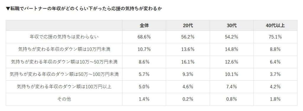 さらに、パートナーの転職を応援すると回答した人に対し、転職によって年収が下がった場合に応援の気持ちが変わるかを聞いたところ、「年収で応援の気持ちは変わらない」と回答した人は68.6%となった。年代別では、20代が56.2%、30代が54.2%、40代以上が75.1%となり、40代以上では年収低下による影響を受けにくい一方、20代や30代では年収の変化が応援の気持ちに影響しやすい傾向がうかがえるとしている。