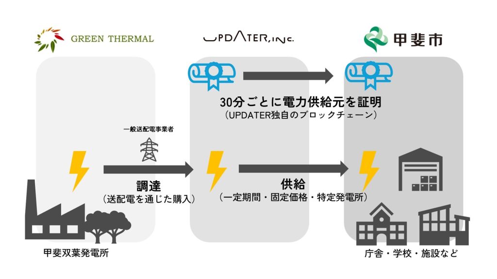 電力は、グリーン・サーマルが運営する甲斐双葉発電所で発電された木質バイオマス由来の再生可能エネルギーを、送配電事業者を通じてUPDATERが調達し、甲斐市の公共施設へ供給する仕組み。