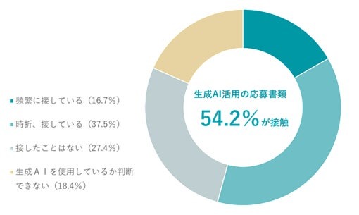 採用選考において、応募者が生成AIを使用したと思われる書類や回答に接したことがあるか調査したところ、54.2%が「接している」(頻繁に接している:16.7%、時折、接している:37.5%)と回答。