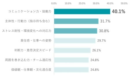 さらに、書類選考や面接といった一般的な採用プロセスでは把握しづらく、入社後にギャップを感じやすい応募者情報について尋ねたところ、最多は「コミュニケーション力・協働力(40.1%)」、次いで「主体性・行動力(指示待ち含む)(31.7%)」、「ストレス耐性・環境変化への対応力(30.8%)」と続く。